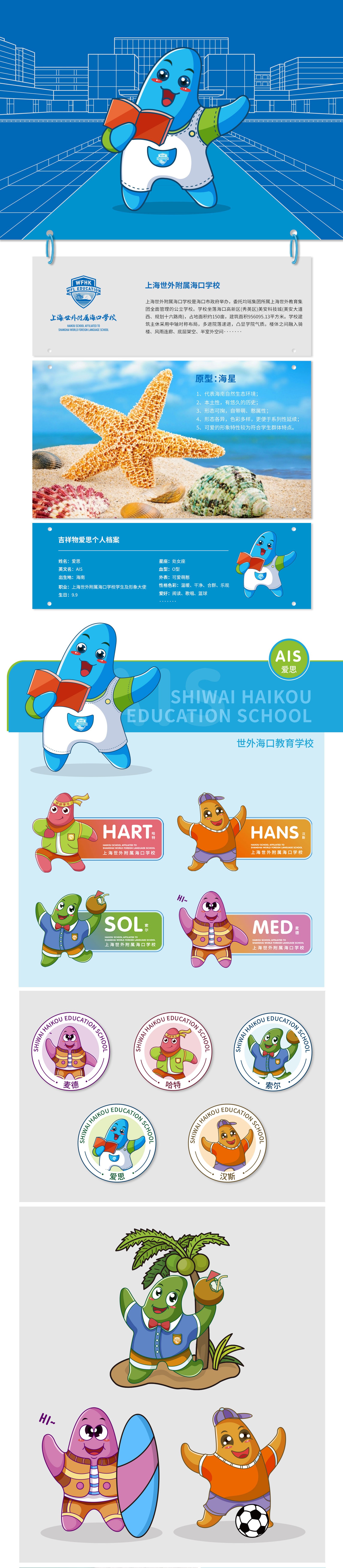 考慮到這所學(xué)校位處海口,地理位置優(yōu)越,環(huán)境優(yōu)美,景色宜人,同時(shí)作為學(xué)校及學(xué)生的宣傳大使,需要具備辨識(shí)度高、記憶點(diǎn)強(qiáng)的特點(diǎn)。基于此,石特在對(duì)吉祥物進(jìn)行設(shè)計(jì)創(chuàng)作時(shí),選取以海星為原型,其不僅能代表海南自然的生態(tài)環(huán)境,還具有本土性強(qiáng),歷史悠久的特性;通過對(duì)學(xué)生群體性格特征及愛好的分析,擬化出自帶萌性的卡通形象,特征明顯極易辨認(rèn);吉祥物以系列化的形式進(jìn)行呈現(xiàn),整體顏色明亮活潑,其中有熱愛唱歌的“麥穗”,認(rèn)真學(xué)習(xí)的“哈特”,樂觀向上的“索爾”,喜歡閱讀的“愛思”以及愛足球運(yùn)動(dòng)“漢斯”,它們形態(tài)可掬,萌感十足,符合學(xué)生群體的特點(diǎn)。本次石特為上海世外附屬海口學(xué)校的吉祥物的成功策劃,得到了客戶的高度認(rèn)可。
