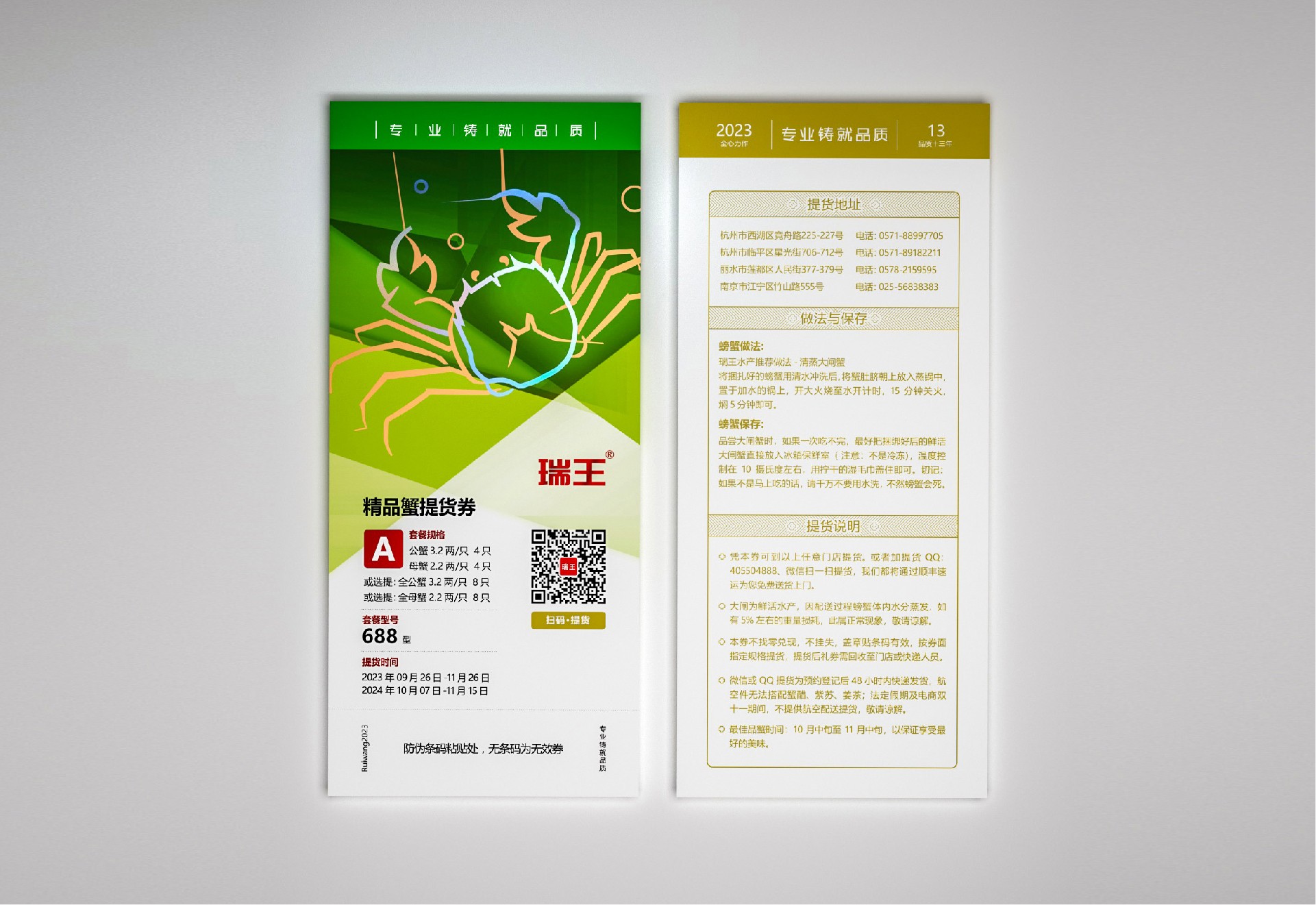 采用信封式包裝,以黃色為主色調(diào),代表大閘蟹的鮮美。在信封的正面上部印有瑞王大閘蟹的LOGO,以突出品牌形象,并附上“品質(zhì)十三年”的口號(hào),展示企業(yè)的信譽(yù)度。