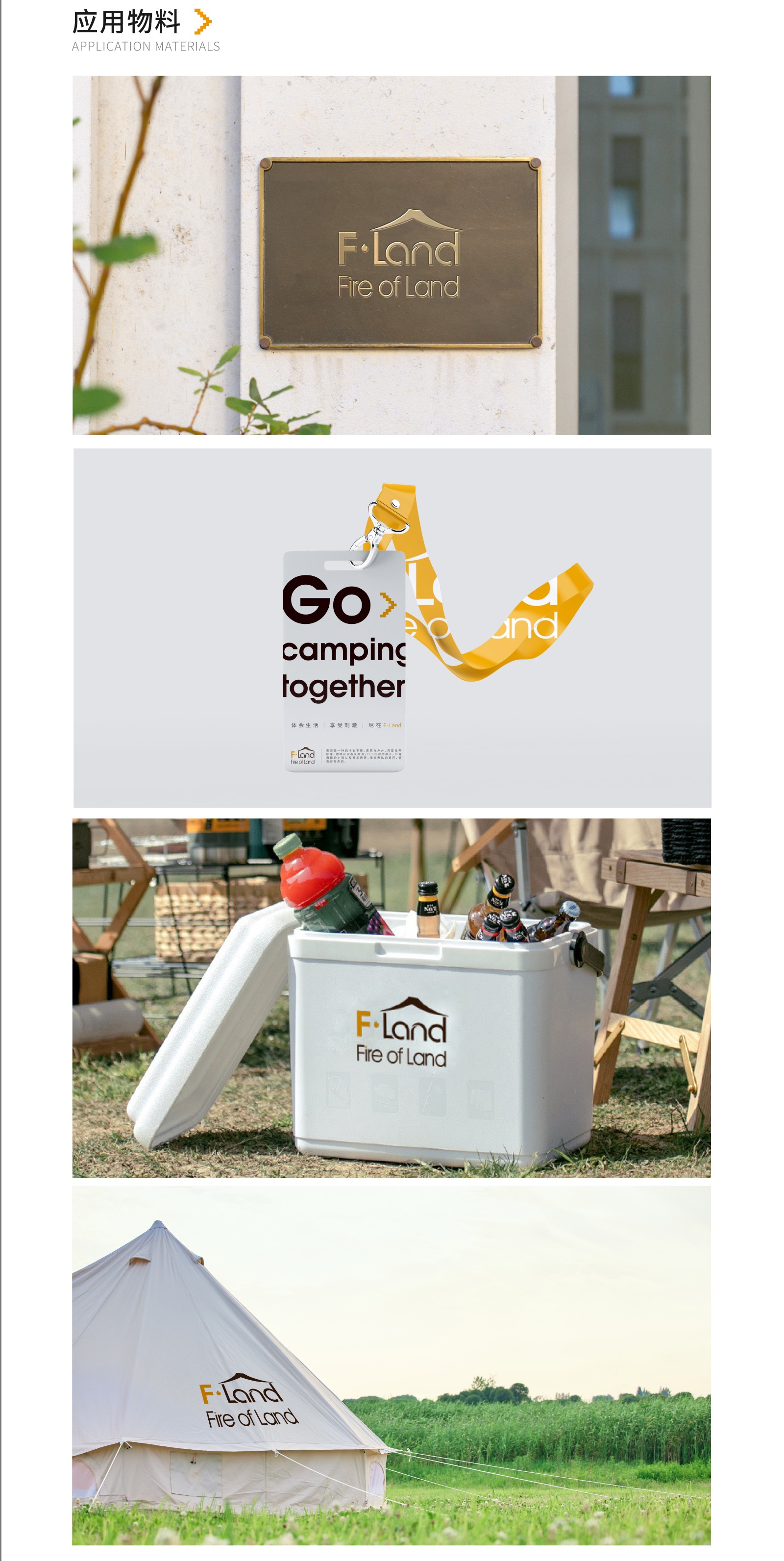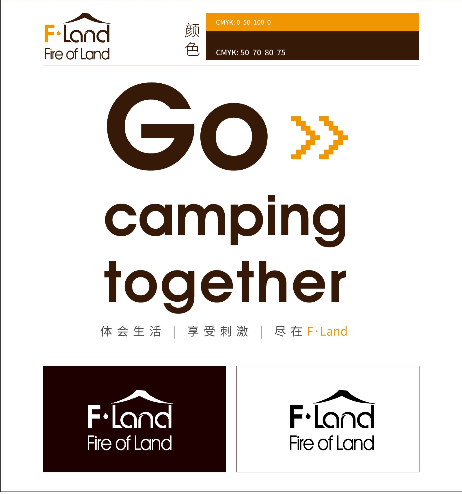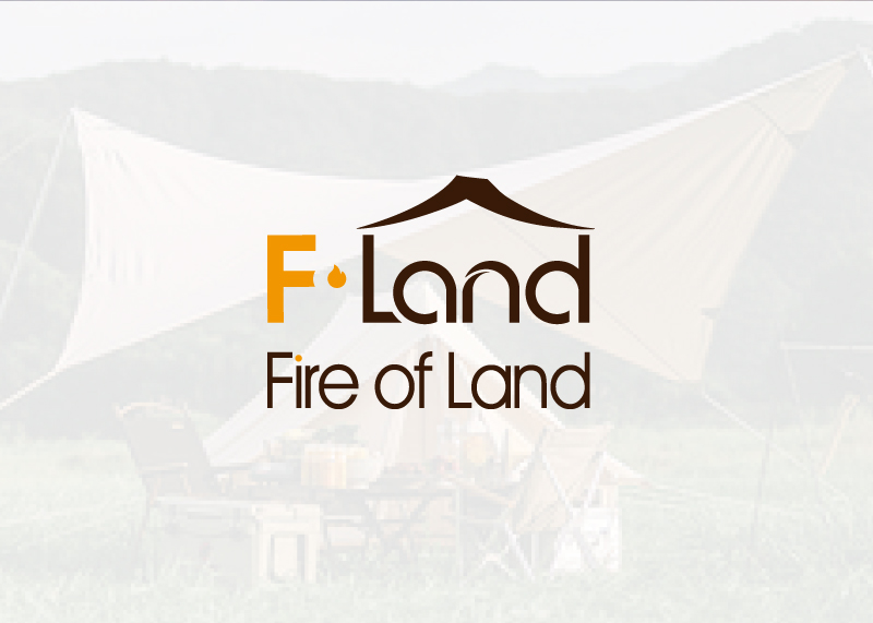 通過“F.Land"與戶外露營帳篷的外形提取設計,組合。元素中的“land"中文意思為“陸地”,帳篷作為戶外露營重要的工具,在英文“land"上方加入帳篷元素,兩者巧妙結合,體現出了戶外露營者在陸地上搭建帳篷的這一特點,突出品牌的定位一戶外露營。