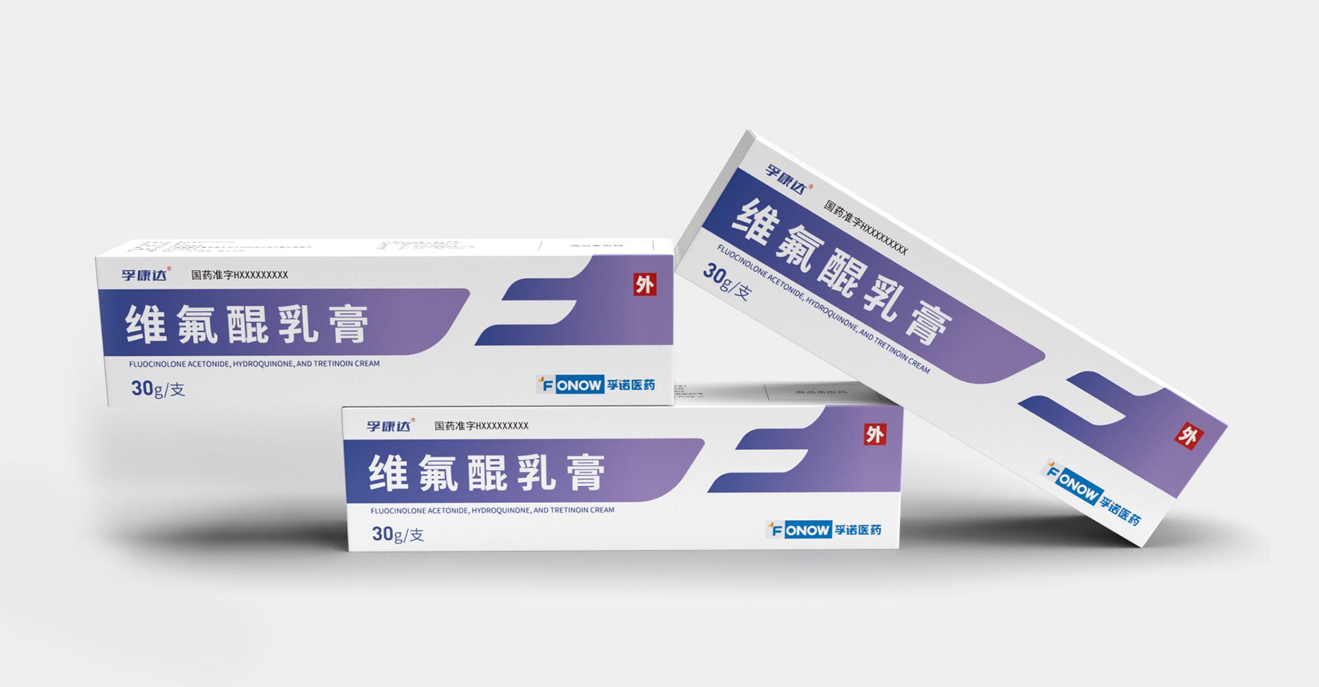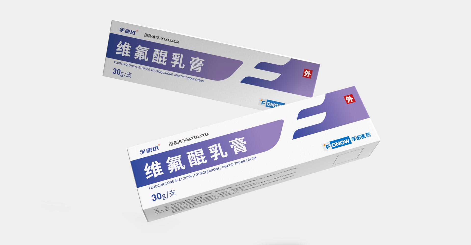 孚諾醫藥兩批次委托石特大健康進行產品包裝設計,首次設計產品上市滿意后進行了二次新款的設計;為維氟醌乳膏設計包裝:“孚康達”的首字母“F”進行創意設計,紫色、白色色塊勾勒“F”字形,增強品牌識別,紫色寓意優雅、高貴,以其為主色與產品主要治療功效變美的預期目標相符合。同款產品兩個渠道不同設計方案。