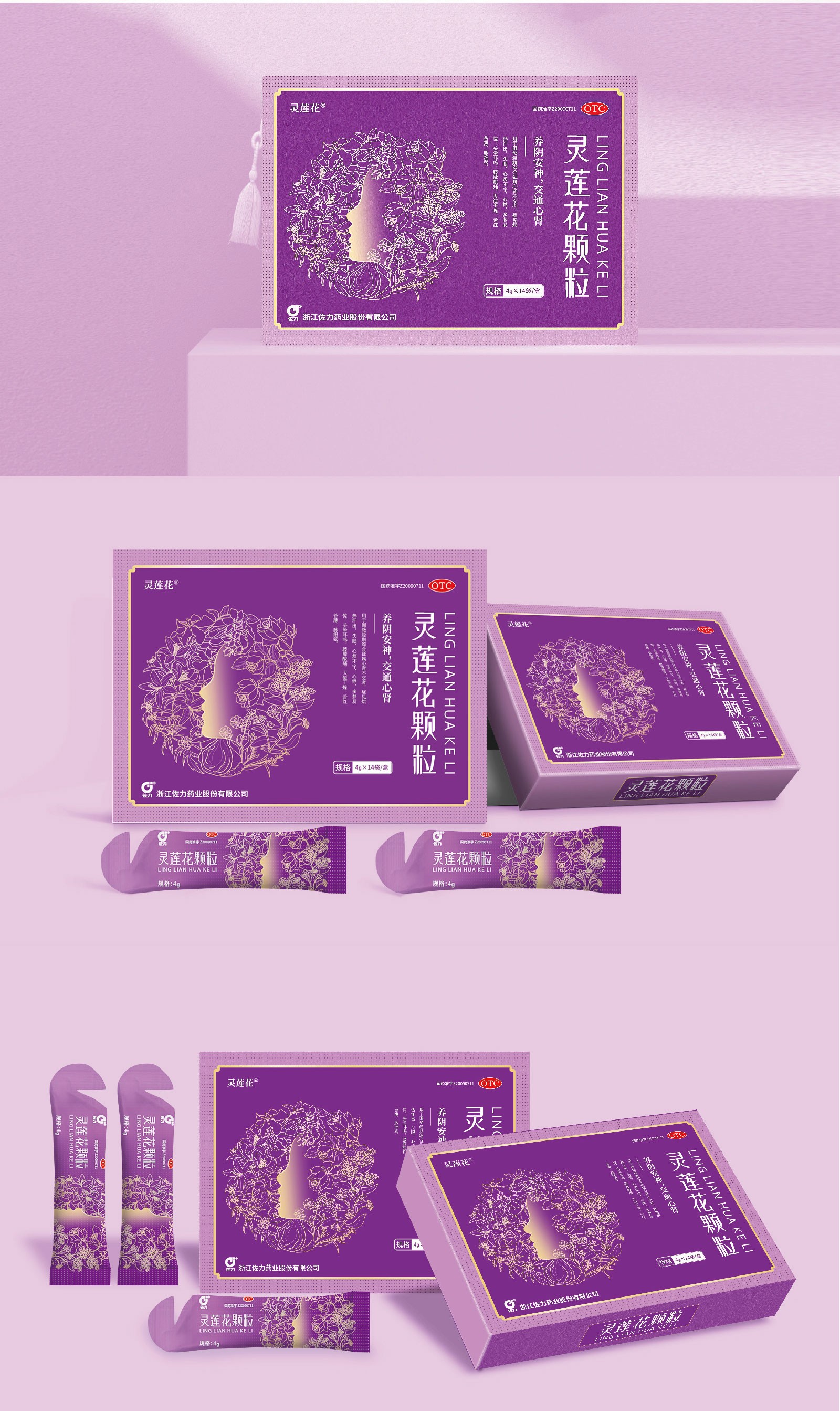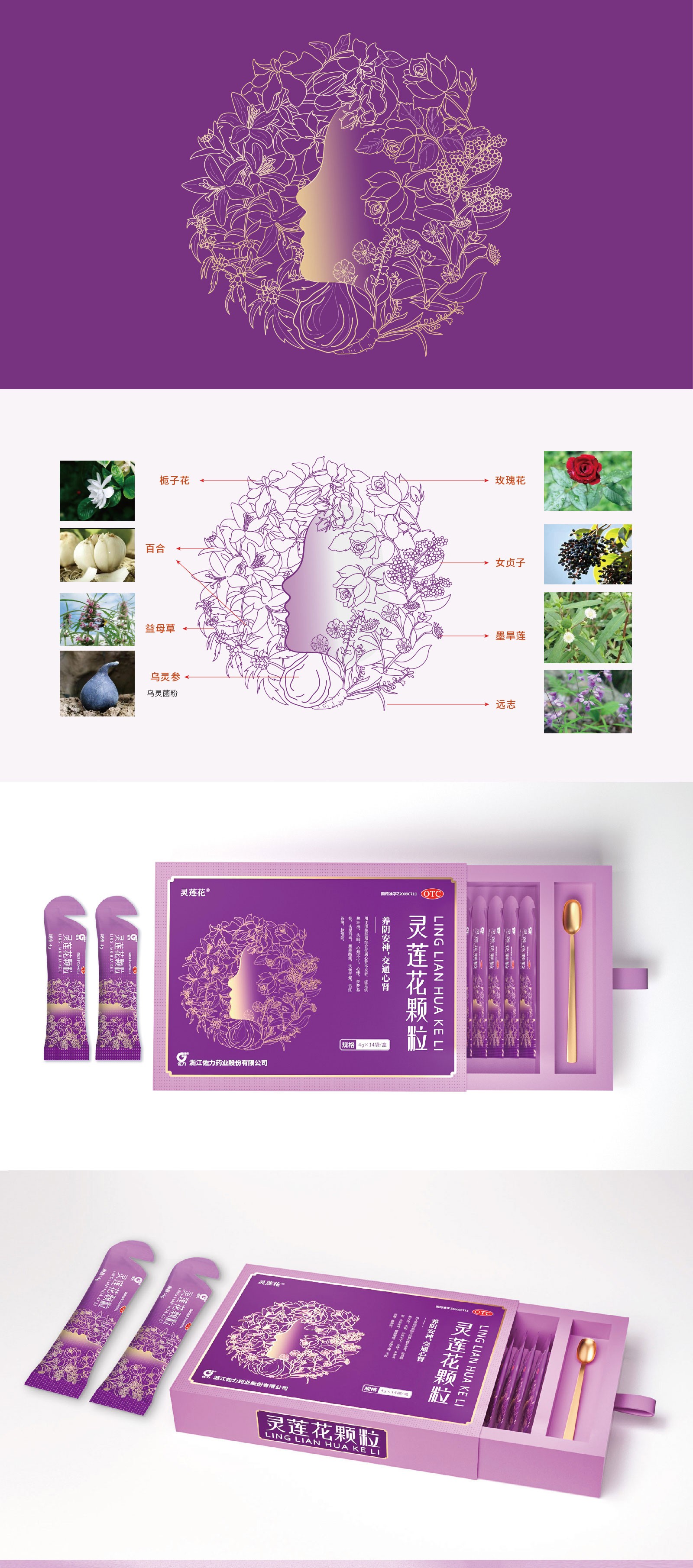 佐力藥業集科研、生產、銷售于一體的國家高新技術制藥企業立足于藥用真菌生物發酵技術生產中藥產品,集中成藥、中藥飲片、中藥配方顆粒的中藥全產業鏈。設計畫面融入鄰近色,色彩應用層次分明,紫色在色彩能量中屬最崇高的色彩,代表自信與尊貴。淡紫色使女性的形象優雅、溫柔,而深紫色則讓人感覺華麗,包裝采用淡紫色和深紫色結合,受女性的歡迎。