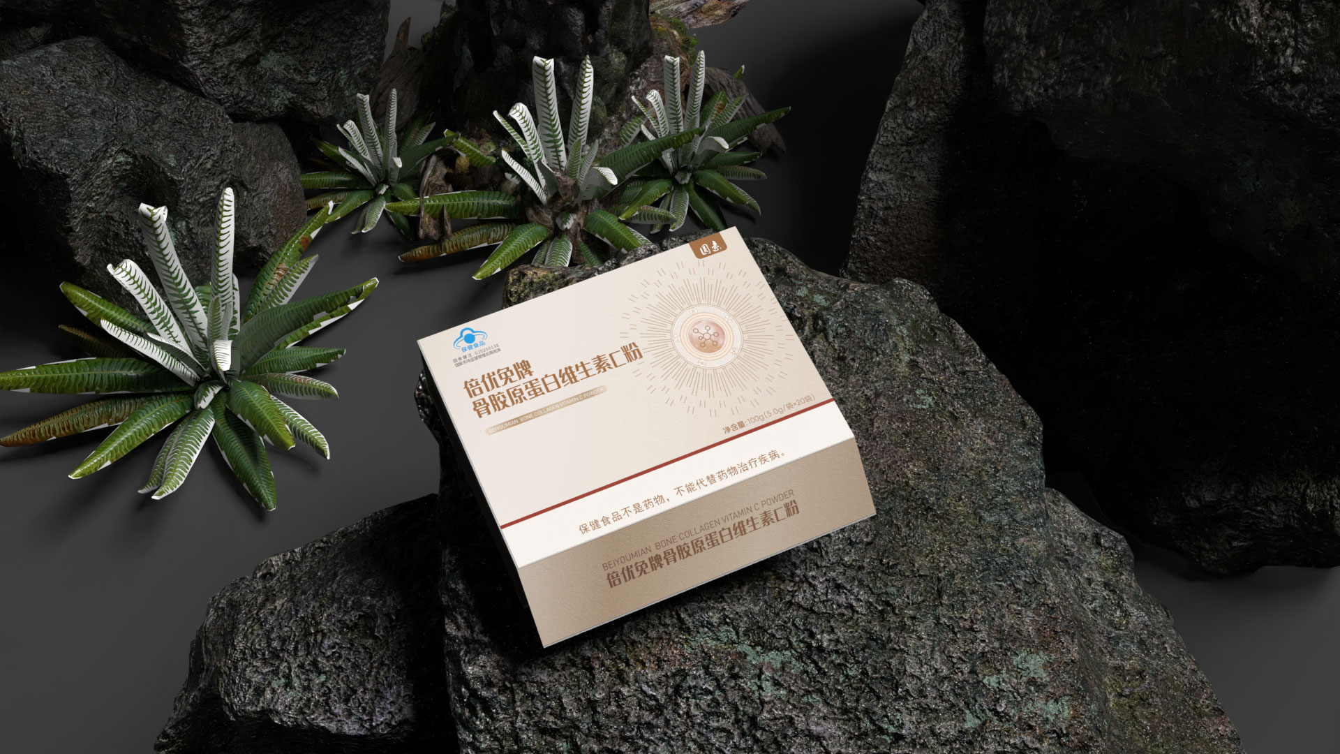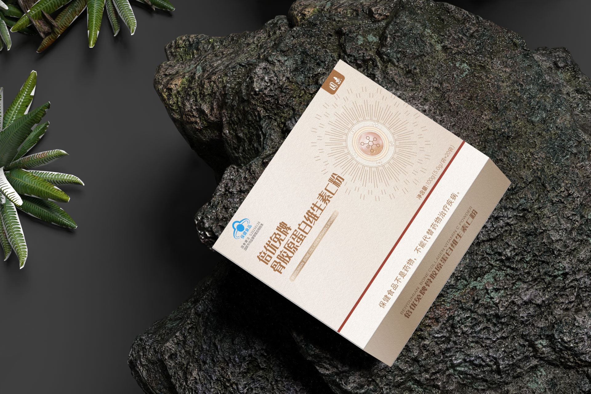 圖形符號: 設計了一個抽象的 “分子融合” 圖標,巧妙地將膠原蛋白螺旋結構與維生素C分子形態相結合,直觀傳達“科學配比,協同增效”的產品核心。