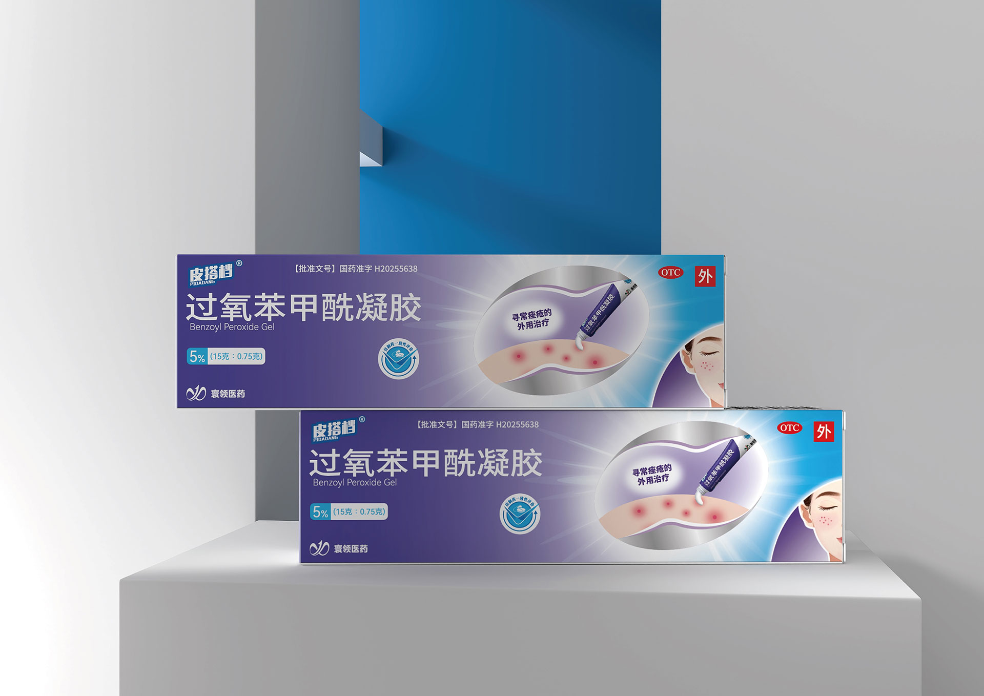 過氧苯甲酰凝膠小盒:尺寸105×45×32mm,推薦燙金工藝,金色質感傳遞產品的高效與品質。
