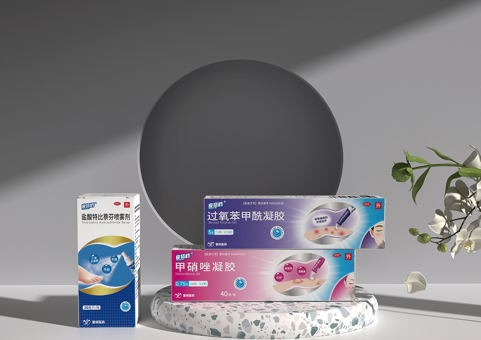 功能差異化與統一性的矛盾:甲硝唑凝膠(祛痘/抗炎)、鹽酸特比萘芬噴霧劑(抗真菌)、過氧苯甲酰凝膠(祛痘/殺菌)分屬不同治療領域,包裝需在統一家族感下,清晰傳遞各自的功能差異。